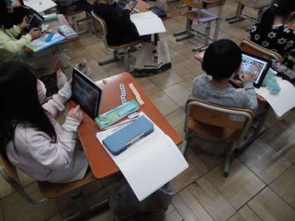 どんぐりを9個拾ったけど、友達は2個少なかったそうです。友達はいくつ拾ったのか、数図ブロックを操作しながら考えました。ブロックを写真に撮り、タブレット上に考えを書き込んでから先生に提出しました。それをもとに周りの人にも説明し合いました。自分の考えを一生懸命伝えようとがんばっていました。