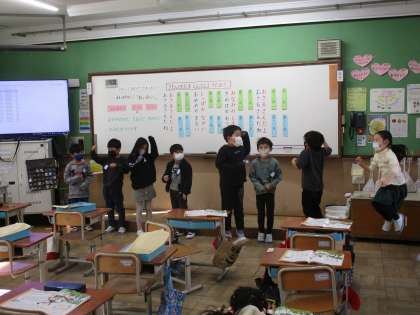 音楽で「あいあい」を歌いました。曲を聴いて強弱やメロディなどの曲の感じをつかみ、それが歌い方に表現できるように考えました。自分なりに考えた歌い方や振り付けをお互いに見合いました。元気よく跳んだり、腕を軽快に振ったりと、工夫した歌い方がたくさん見られました。