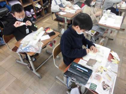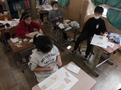 前の時間に材料を組み立てながら、どんな生き物を作るか自分のイメージを膨らませました。今日は、アイデアスケッチをもとに組み立てていきました。まずはボンドで接着してから釘で丈夫にすることになりました。ボンドが乾くまで、しばらく押さえたり待ったりしていました。
