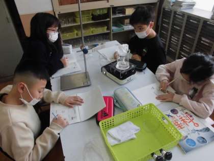 今日の理科では、湯気の正体を探るために水をふっとうさせて出てきた湯気を袋に集めました。沸とうしている間は、袋がふくらんでいたのですが、火を消すとだんだんしぼんできました。よく見ると、袋の中に水滴らしきものが確認できます。正体は一体何なのか、考えていました。