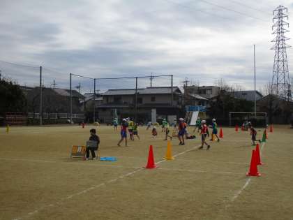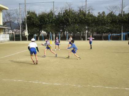 4年生の体育ではタグラグビーを学習しています。ここまでに何試合もしているので、ボールの扱い方やゲームでの動き方などにはすっかり慣れ、チームの中で作戦を立て、相手に止められずにボールを前へ進められるよう工夫をしていました。自分のプレーだけでなく、チーム内で声をかけ合う姿もたくさん見られました。