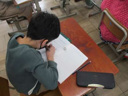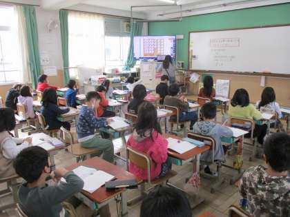 今日は1000をこえる数の表し方やしくみについて学習しました。漢数字で表す問題に、はじめは難しいと感じていた子どもたちも、大型テレビで1000、100、10、1がいくつあるのかみんなで確かめると、「わかった!」と言いながら、嬉しそうに問題の答えをノートに書く姿が見られました。