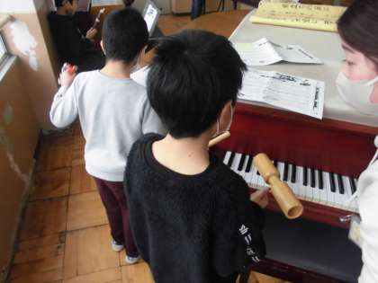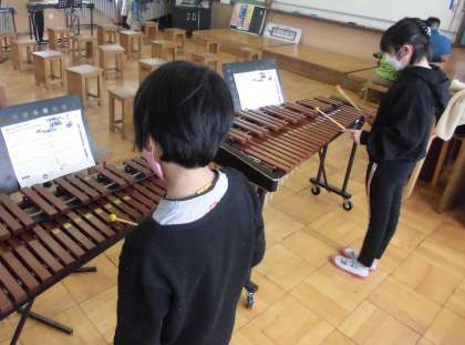 音楽の時間には、みんなで合奏に取り組んでいます。ピアノや木琴、ウッドブロックなどいろんな楽器を使うので、役割分担をして練習に励んでいました。楽譜を見ながら丁寧に音を出したりリズムよくたたいたりしました。