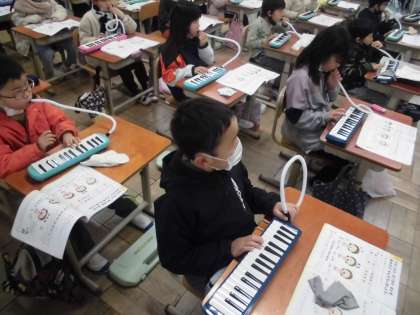 今日の音楽は、「とんくるりん ぱんくるりん」という曲に合わせて鍵盤ハーモニカを使って演奏しました。最初は「ミ」と「ファ」の音が出てきます。鍵盤を押さえる指をみんなで確認してから、先生の合図で演奏してみました。何度も練習しているうちに、リズムも合って音がそろってきました。