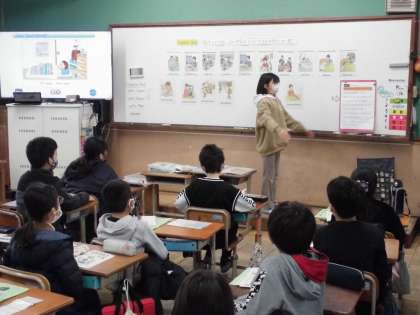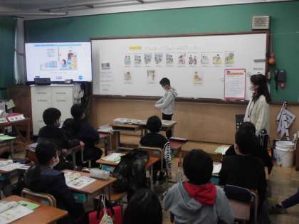 毎日の生活では、朝起きると顔を洗い、身支度をしてから学校に行きます。学校では勉強したりみんなと遊んだりします。帰ってからは宿題をしたりご飯を食べたりします。そういった1日の行動を英語でどう表すか学習しました。代表の人が絵カードを見て、みんなにゼスチャーで表し、それを見てみんなが答えていました。何をしているか分かるけど、英語ではどう言ったらいいか思い浮かばず、悔しそうにしている子もいました。