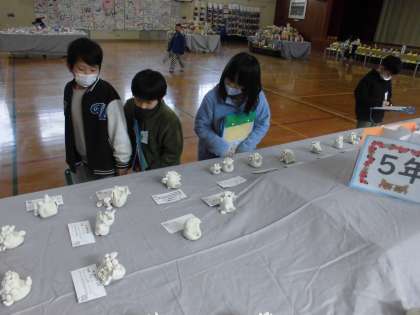 今日から作品展が始まり、体育館にはみんなの絵画や工作などを展示しています。6年生はバスケットボール選手やパン屋さん、魚を釣り上げているところなど、未来の自分をイメージした作品を展示していました。また、オリジナルのシーサーを作っている5年生や木を組み合わせて動物をつくった3年生など、各学年ともテーマをもって工作に取り組んでいる様子がよく分かりました。鑑賞しに来た子達は、学年を超えて作品の良さに触れていました。