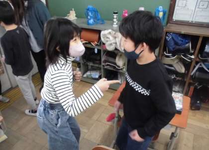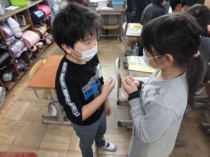 外国語活動では、たずねる表現を学習しています。今日は、慣れ親しめるように猫や犬、うさぎなど自分の持ったカードの動物になりすまし、友達が「Who are you?」と聞かれた時にヒントを出しながら答えていました。やり取りを繰り返すことで慣れていってほしいです。