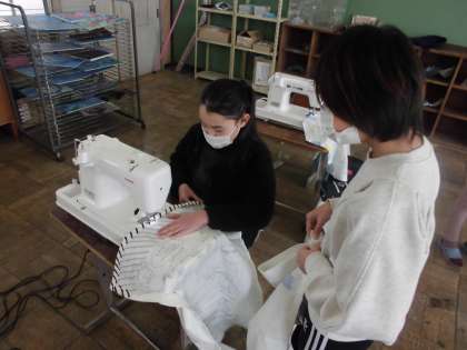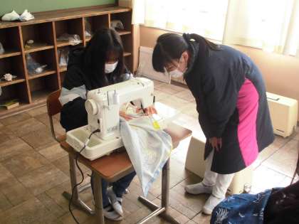 家庭科ではエプロンづくりに取り組んでいます。エプロンの周りを丈夫にするために折り返してアイロンをかけました。なかなかまっすぐに折り目がつかなくて苦労していました。アイロンがけが終わったら、ミシンで縫っていきます。手順を丁寧に確かめながら、ミシンを操作していました。