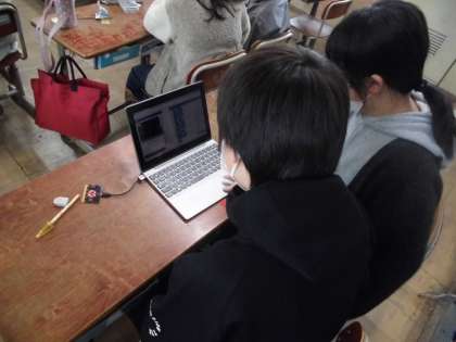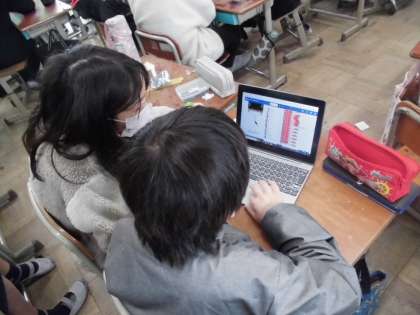 理科の時間には、プログラミングの学習をしました。どのように光るようにするか考えた後、ソフトに入力していきました。思った通りに光ってくれると、喜んでいました。