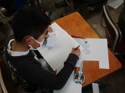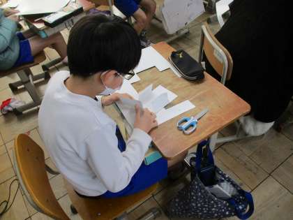 今日は直方体の展開図を書く学習をしました。どんな面があり、どこと付いていて、辺はどれくらいの長さか、一つ一つ確認しながら展開図を書いていました。書き終えた展開図を切って、直方体になるのか確かめていました。みんな出来上がった直方体を見てご満悦でした。