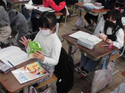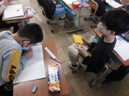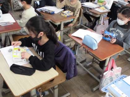 身の回りにはいろんなはこの形があり、様々な用途で使われています。今日の算数では、おうちから持ってきた箱を使って、辺の数やちょう点の数を数えてみました。各自でやってみると、いろんな答えが出てきたので、数える順番を確かめました。まず、上の面について数え、次に下の面について数えるようにするとできていました。