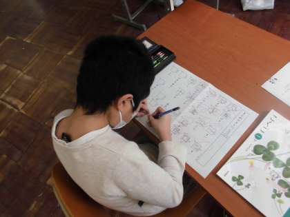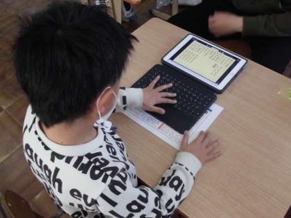 国語では、ひらがなやカタカナ、漢字など文字の練習をしています。プリントを使って漢字の書き取りをしたりタブレットを使って五十音をおさらいしたりしました。思い出せない時は、じっくり考えていました。