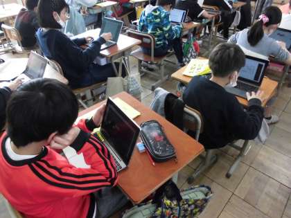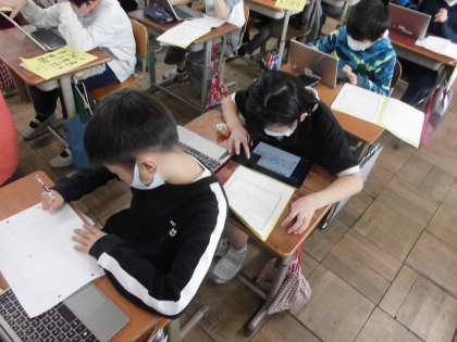 今日の総合的な学習の時間には、妊婦さんや小さなお子さんのいる人が日常生活でどんな工夫をしているのか、またどんなことを願っているのか調べたことをロイロノートに記入しました。数枚のスライドを作って、相手に分かりやすいようカラーを入れたりしていました。世の中には、自分たちだけでなく、いろんな人が生活していて、誰もが幸せを願っていることに気づいてほしいです。