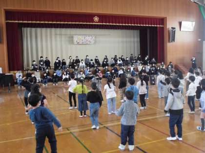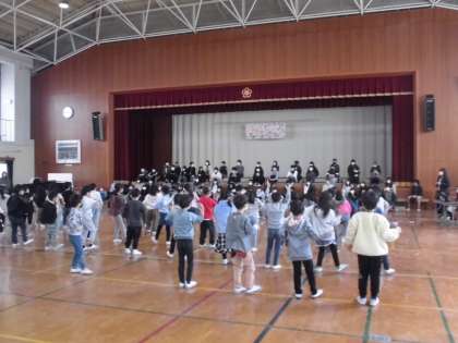 今日は体育館で6年生を送る会がありました。各学年、感謝の気持ちを伝える時に体育館へやってきて言葉を言ったりダンスをしたりしました。1年生も練習してきたダンスを披露しました。リズムにのって楽しそうに踊っていました。