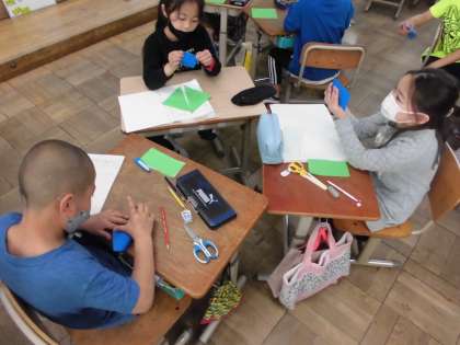 今日の算数では「分数」について学習しました。一人ずつ色紙を折って半分の大きさを作りました。折り方によってできる形はちがうけれど、同じ半分なので大きさは一緒です。ななめに折ることが難しそうでした。
