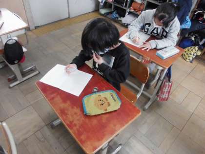 毎年、春になると有栖川のライトアップがあります。それに向けて、3年生はとうろうの絵を描きました。テーマを「京都」にして、有名な場所やおすすめポイントを選んで描くようにしました。はっきりと思い出せない子は、タブレットを使って調べていました。
