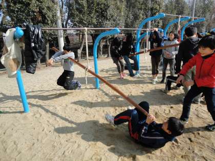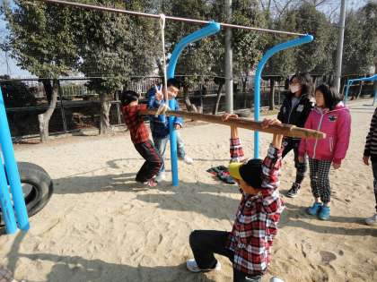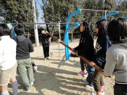 理科は「てこのはたらき」の学習に入りました。今日は「てこをつかって重いものを持ち上げてみよう」という実験をしました。運動場におおきなてこを作り,友達を持ち上げてみました。体の大きな子が簡単に持ち上がると歓声があがりました。
