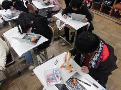 1年間で図工や習字などで取り組んだたくさんの作品をもって帰るために作品バックを用意しています。真っ白なバックなので、自分が好きな絵を描くことにしました。覚えているイラストを描く子もいれば、タブレットで調べてお気に入りのイラストを丁寧に描く子もいました。作品とともにバックもいい思い出になりそうです。