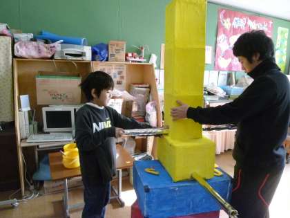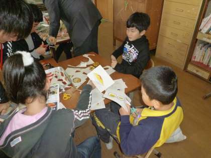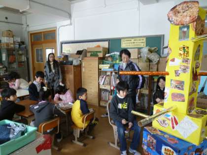 1回目は土台に食べ物の写真や絵をはったり,キラキラのポールをさして枝にしたりしました。