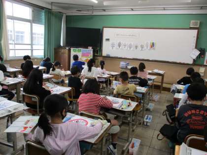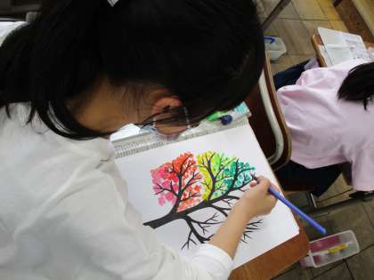 4年生初めての図画工作では、学年だよりの名前にちなんで「カラフルな木」を描きました。筆を使ったり指を使ったりして、木の幹や枝に色を付け、思い思いにカラフルな木を表現していました。