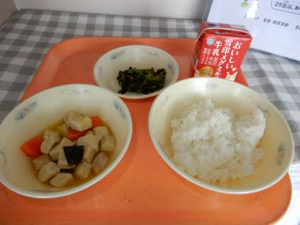 ごはん、牛乳、高野どうふと野菜のたき合わせ、小松菜のごまいため