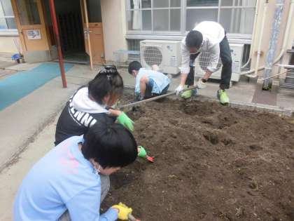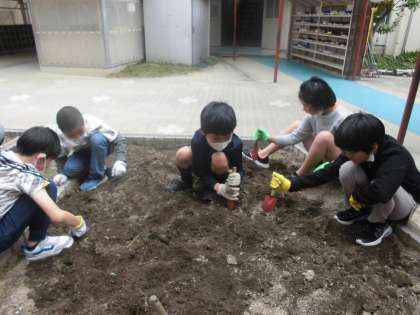 生活単元の学習で畑のお世話をしました。春休みの間に生えた雑草をみんなで協力して抜き綺麗にした後うねを作りました。みんなで相談をして、夏野菜とサツマイモを植えることを決めました。今年度もみんなで協力して水やりや雑草抜きをしてお世話していきたいと思います。