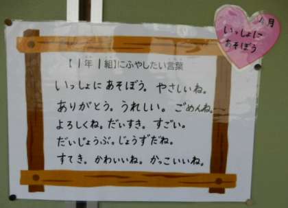 4月17日(月)は「いいことばの日」でした。1年生で『ふやしたいふわふわことば』は、「いっしょにあそぼう(1組)」「ありがとう(2組)」に決まりました。