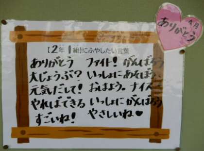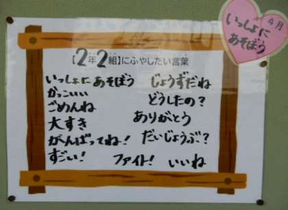 4月17日(月)は「いいことばの日」でした。2年生で『ふやしたいふわふわことば』は、「ありがとう(1組)」「いっしょにあそぼう(2組)」に決まりました。