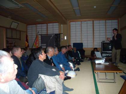 梅津北小学校のふれあいサロンで,北梅津自主防災会主催の「防災研修会」が行われました。宇都宮会長のあいさつ,そして北村学校長の講師の先生の紹介の後,