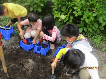 前回、畑にトマトの苗を植えたときの植え方を思い出して自分たちで上手に植えていました。