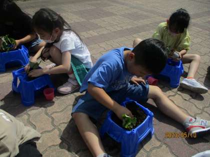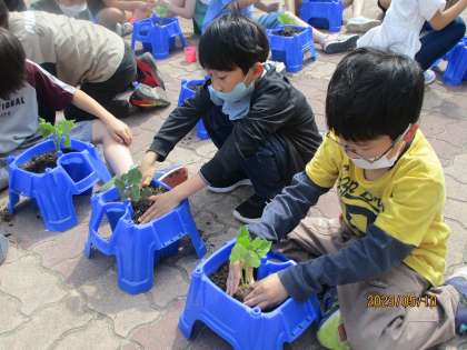 生活科「ぐんぐんそだておいしいやさい」では自分たちの鉢に野菜の苗を植えました。