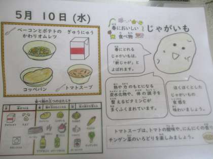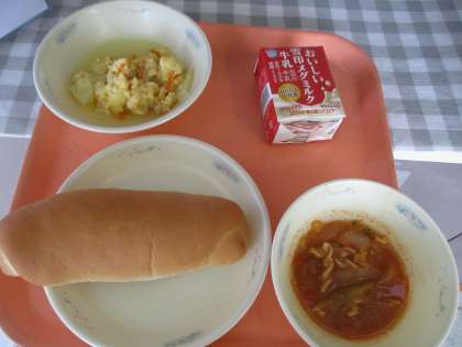 コッペパン、牛乳、ベーコンとポテトの変わりオムレツ、トマトスープ