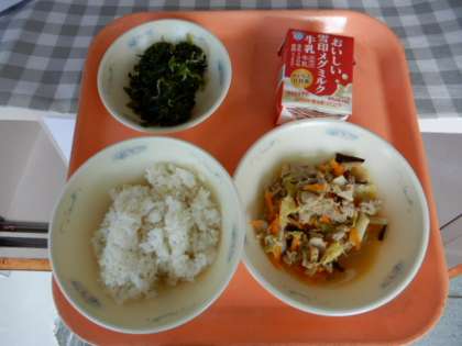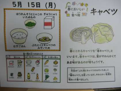 麦ごはん、牛乳、豚肉とキャベツのみそいため、ほうれん草とじゃこのいためもの