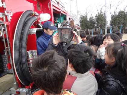 まずは,消防車を見せていただきました。消防車は,いろいろな設備が搭載されていて,子どもたちも興味津々でした。