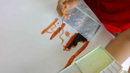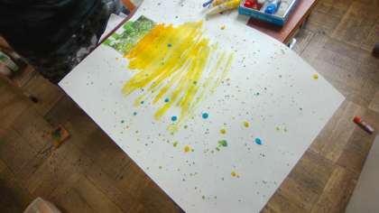 1枚の写真から想像を膨らませて、自分の思い描く世界を画用紙いっぱいに表現しています。子供たちの発想、想像力に驚かされます。ただ描くだけでなく、吹き流したりはじいたり・・・いろんな工夫がみられました。完成がとても楽しみです。