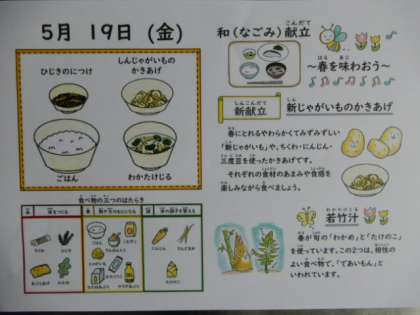 ごはん、新じゃがいものかきあげ、ひじきの煮つけ、若竹汁