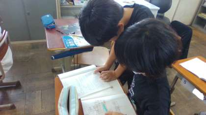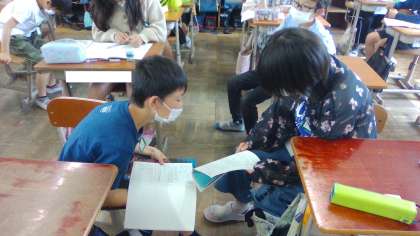 5年生では、小数のかけ算の学習をしています。80×2.3の式になるわけを図に表し、ノートを見せながら説明しました。