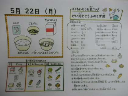 麦ごはん、牛乳、鶏肉ととうふのくず煮、ごま酢煮、じゃこ