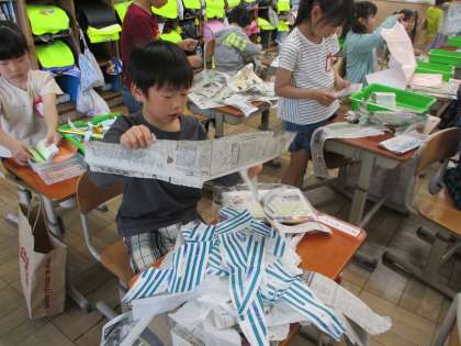 恐竜に見えたり、魚に見えたりと、自由な発想で思い思いの作品を作っています。