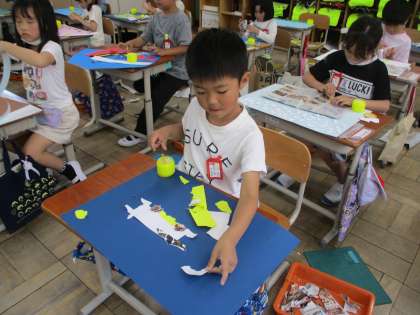 色々な紙を好きなように破り、破いた紙を何かに見立てて画用紙に貼っていきました。