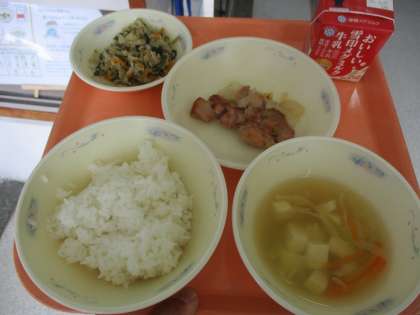ごはん、牛乳、鶏肉のてり焼き、切干大根のごま煮、キャベツのすまし汁