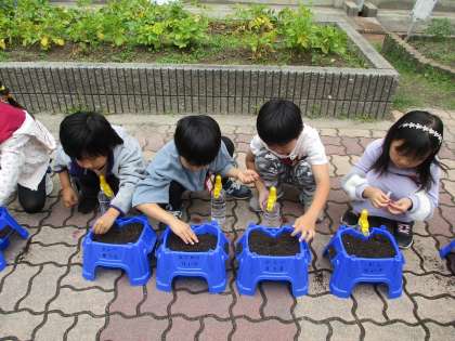 子どもたちは一人ずつ自分の鉢に土を入れ、優しくそっと種をまきました。