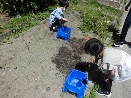 生活科の学習であさがおの種をまきました。植木鉢に土を入れて、「大きくなってね。」「むらさきの あさがおが さいたら いいな。」と言葉にしながら種をまき、水をあげていました。