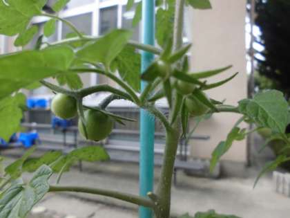 生活単元の学習で夏野菜の観察をしました。どれだけ大きくなったのか高さを定規ではかったり、葉っぱは「ザラザラだ。」と触ったりしていました。花が咲いていることやミニトマトの実ができていることに気付く姿も見られました。じっくりと見たり、触れたりして気付いたことを観察カードにかきました。
