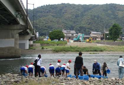 有栖川でフナの捕獲を体験した後、桂川に行って捕獲したフナを放流しました。元気に成長してほしいという思いを込めて、川岸からそっと魚を川に入れました。魚たちが桂川で卵を産んで数を増やすためには、川がきれいな状態で受け継いでいく必要があります。これから環境を守るためにどんなことをしていけばよいかをみんなで考えていきたいです。