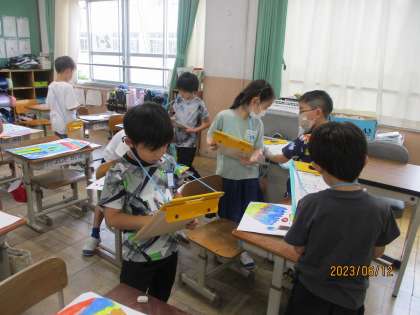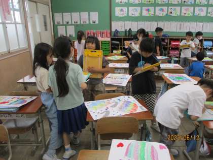 形や色、イメージなどいろいろな視点から友達のいいところを見つけながら作品を鑑賞しました。また、鑑賞後は全体でいいところを友達に伝え合いました。友達から褒められてとても嬉しそうな様子でした。