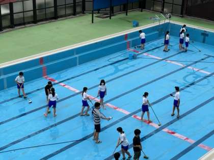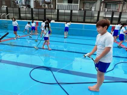 毎年、6年生はプール学習が始まる前に、プール清掃を行っています。今年はいよいよ自分たちの番です!子どもたちは、たわしやブラシを使って、プールの底や、プール壁面や、プールサイドの汚れを一生懸命に落としていました。見違えるようにきれいになったプールを見て、達成感を感じていました。時間になっても、「もっとやりたい!」と言うほど、最後までよく頑張ってくれました。