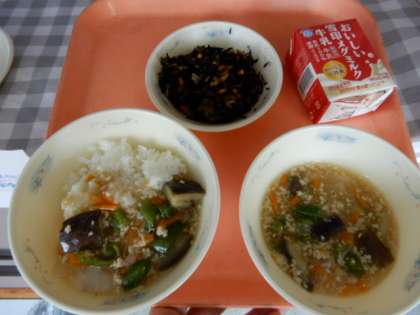 ごはん、牛乳、夏野菜のあんかけごはん(具)、ひじきの煮つけ