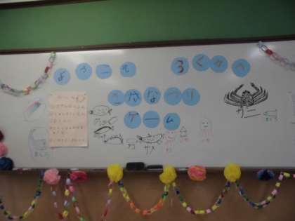 3組で取り組んでいた魚つりに1年生を招待しました。1年生に楽しんでもらうことができるように、司会やルール説明、つり竿を配る係、タイマーなど役割分担をしてさかなつりゲームを進めました。1年生もとても楽しんで魚つりをしてくれて、楽しく交流することができました。
