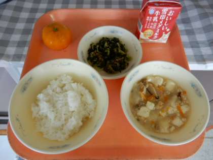 ごはん、牛乳、鶏肉ととうふのくず煮、だいこん葉のごまいため、みかん